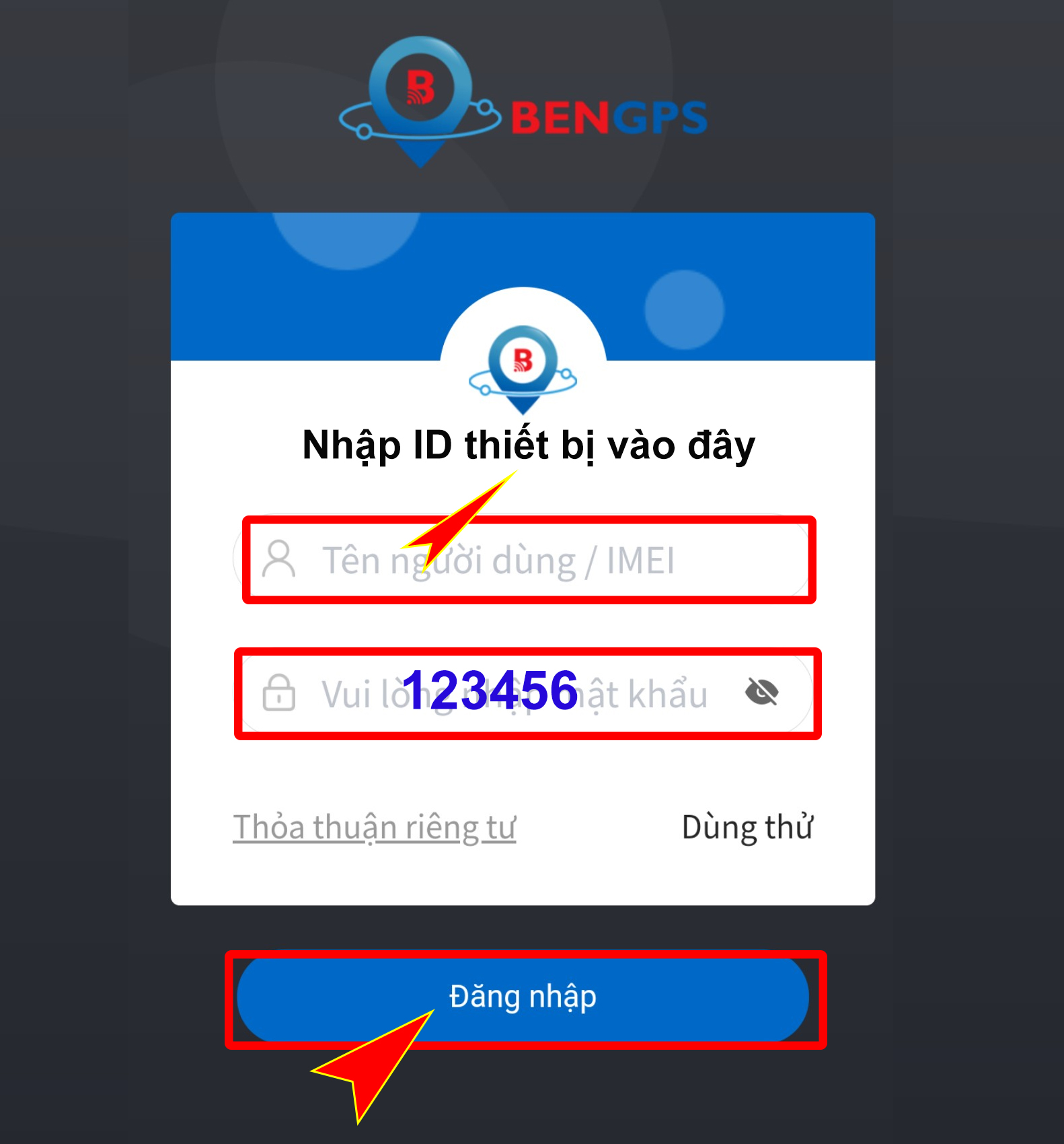 Đầu tiên, bạn cần truy cập app BEN GPS, bằng ID và mật khẩu của tài khoản nếu, thiết bị truy cập được nhưng không hiện vị trí tracking của thiệt bị kiểu như thế này